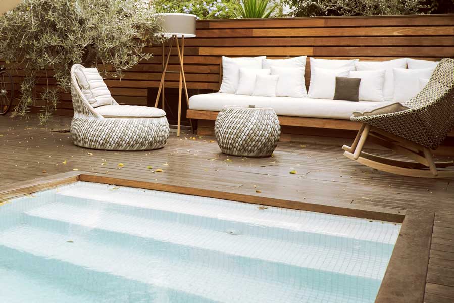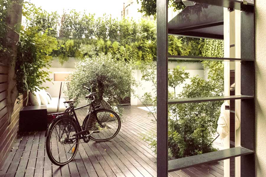 Nos centramos en los elementos positivos que disponíamos. Pusimos en valor las paredes altas, colonizándolas con revestimientos naturales y vegetación colgante. El jardín se llenó con gran profusión de arbustos y plantas situados estratégicamente para crear rincones de privacidad.