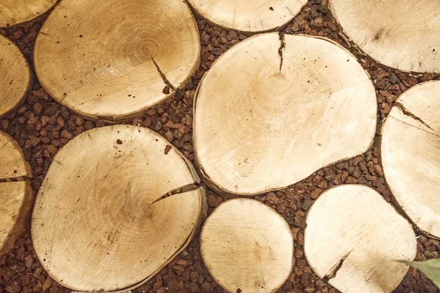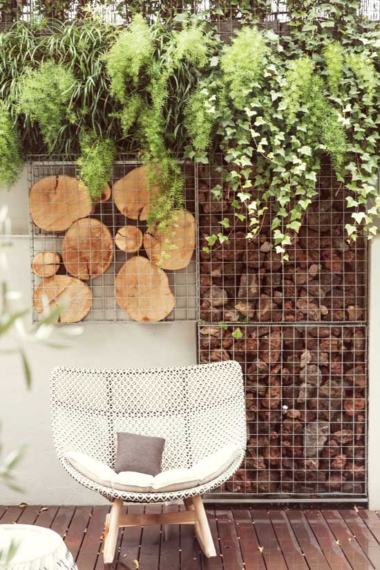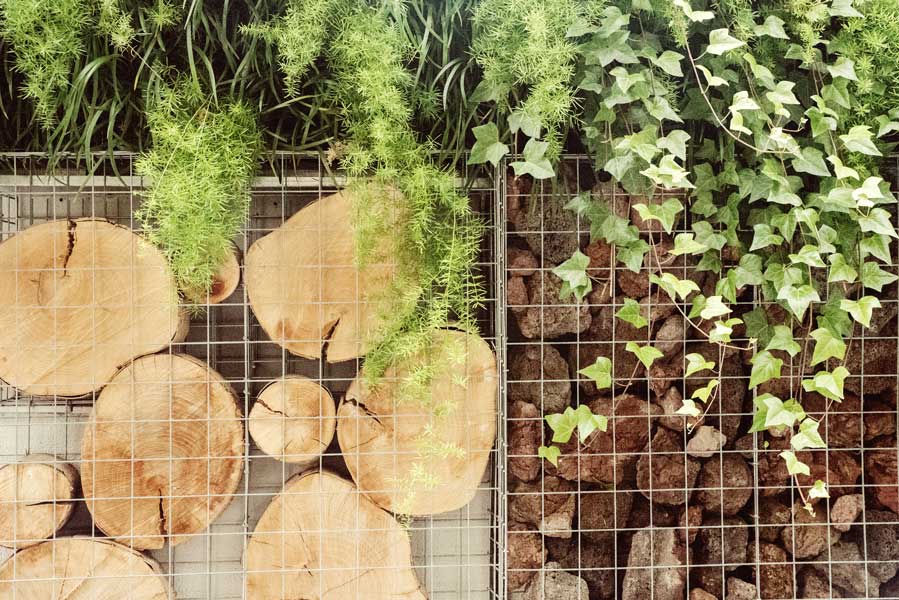 ​La excavación de la piscina nos dio la oportunidad de plantar a cota cero. Se incluyó un olivo de medio siglo, el sueño del cliente. Para las paredes propusimos un tetris de gaviones con naturaleza muerta: troncos de plátano hispánica del entorno de Barcelona, piedra mineral volcánica, y un tercero con vegetación viva.